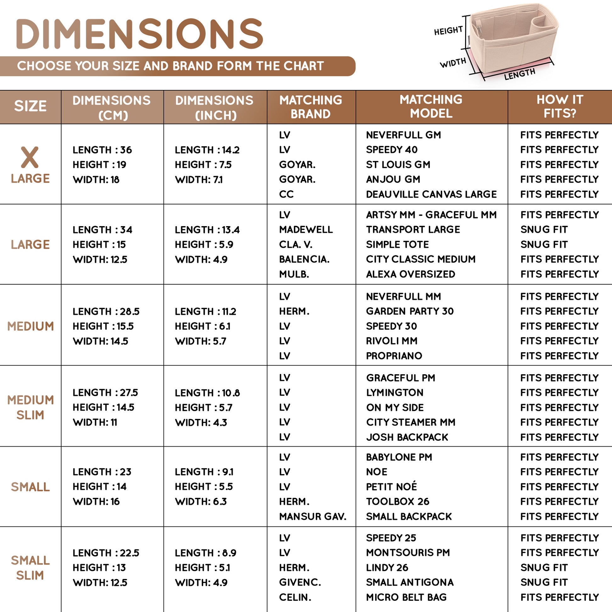 - ORGANIZER SIZES AND COMPATIBLE POPULAR BAG MODELS; SMALL SLIM: 8.9 x 5.1 x 4.9 FITS PERFECTLY for Speedy 25, Montsouris PM SMALL: 9.1 x 5.5 x 6.3 FITS PERFECTLY for NOÉ, Toolbox 26 MEDIUM SLIM: 10.8 x 5.7 x 4.3 FITS PERFECTLY for Graceful PM, On My Side MEDIUM: 1.2 x 6.1 x 5.7 FITS PERFECTLY for Neverfull MM, Speedy 30 LARGE: 13.4 x 5.9 x 4.9 FITS PERFECTLY for Artsy MM, Graceful MM, City Classic Medium X-LARGE:14.2 x 7.5 x 7.1 FITS PERFECTLY for Neverfull GM, Speedy 55
