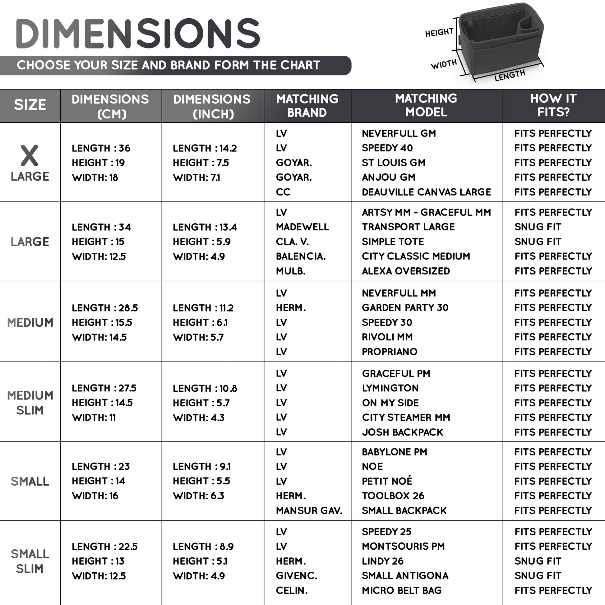 - ORGANIZER SIZES AND COMPATIBLE POPULAR BAG MODELS; SMALL SLIM: 8.9 x 5.1 x 4.9 FITS PERFECTLY for Speedy 25, Montsouris PM SMALL: 9.1 x 5.5 x 6.3 FITS PERFECTLY for NOÉ, Toolbox 26 MEDIUM SLIM: 10.8 x 5.7 x 4.3 FITS PERFECTLY for Graceful PM, On My Side MEDIUM: 1.2 x 6.1 x 5.7 FITS PERFECTLY for Neverfull MM, Speedy 30 LARGE: 13.4 x 5.9 x 4.9 FITS PERFECTLY for Artsy MM, Graceful MM, City Classic Medium X-LARGE:14.2 x 7.5 x 7.1 FITS PERFECTLY for Neverfull GM, Speedy 55