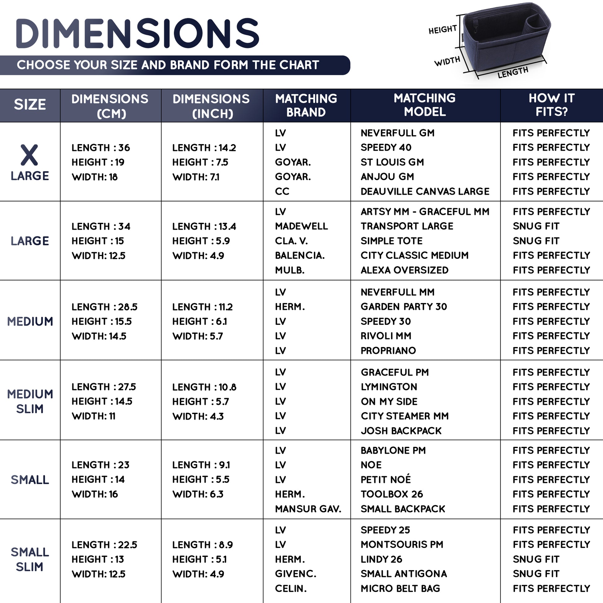 - ORGANIZER SIZES AND COMPATIBLE POPULAR BAG MODELS; SMALL SLIM: 8.9 x 5.1 x 4.9 FITS PERFECTLY for Speedy 25, Montsouris PM SMALL: 9.1 x 5.5 x 6.3 FITS PERFECTLY for NOÉ, Toolbox 26 MEDIUM SLIM: 10.8 x 5.7 x 4.3 FITS PERFECTLY for Graceful PM, On My Side MEDIUM: 1.2 x 6.1 x 5.7 FITS PERFECTLY for Neverfull MM, Speedy 30 LARGE: 13.4 x 5.9 x 4.9 FITS PERFECTLY for Artsy MM, Graceful MM, City Classic Medium X-LARGE:14.2 x 7.5 x 7.1 FITS PERFECTLY for Neverfull GM, Speedy 55